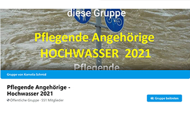 „Angesichts der „ungeheuerlichen Bilder“ aus den Krisenregionen gründete Schmid die Facebook-Gruppe „Pflegende Angehörige – Hochwasser 2021“. Ziel war es für „Gebende und Brauchende“ schnell und unbürokratisch zusammenzubringen. Innerhalb kürzester Zeit wuchs die Gruppe auf über 500 Mitglieder an. Schlafplätze für Pflegende und Pflegebedürftige, Inkontinenzartikel, Nahrung, Rollstühle und vieles mehr wurden gesucht und vermittelt. „Die größte Herausforderung ist die Hilfen an die bedürftigen zu geben“, sagt Schmid. Sie setzt verstärkt auf Netzwerkarbeit mit anderen Organsiationen wie dem Verein AbilityWatch, der eine Seite mit Hilfsangeboten für Menschen mit Behinderungen eingerichtet hat.“